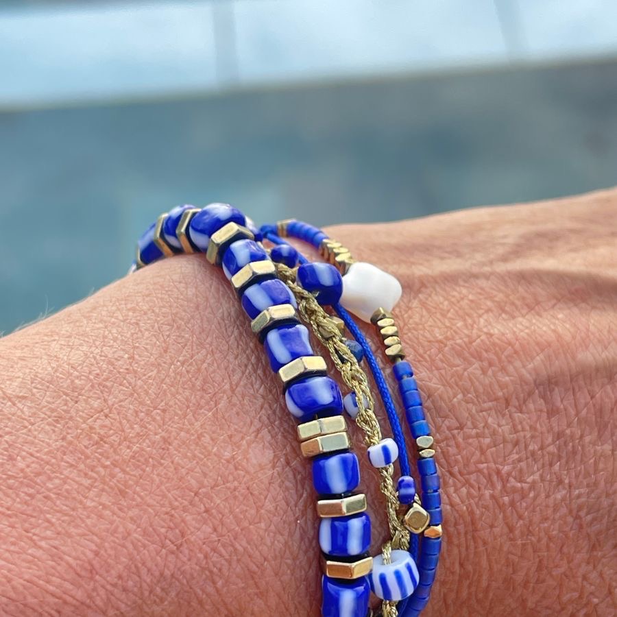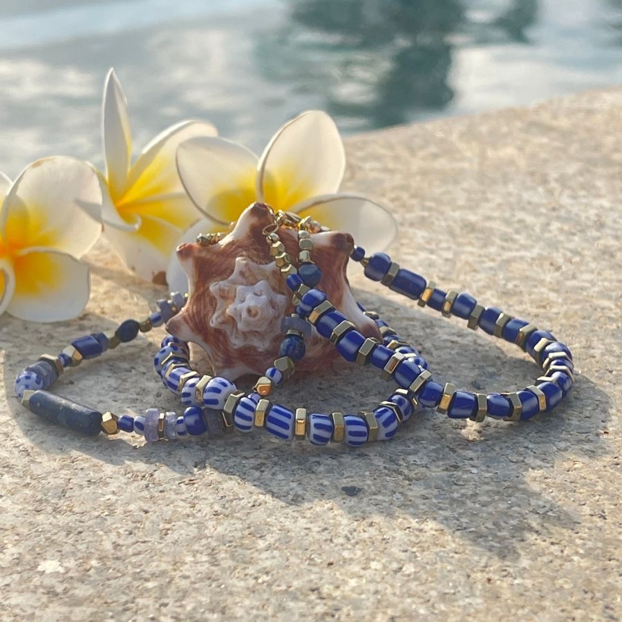 Portez un morceau d'histoire à votre poignet avec le bracelet "ANITA".Cette création unique est un mélange de perles de verre africaines vintage, reconnaissables à leur rayures blanches et bleues et de perles de gemme en lapis-lazuli et de perles en hématite facettées dorées. Autrefois appelées "perles de commerce vénitiennes ", ces perles servaient de monnaie d'échange lors des routes commerciales. Parce qu'elles sont façonnées à la main, chaque perle présente de charmantes irrégularités qui témoignent de son caractère artisanal et font de votre bijou une pièce absolument unique.