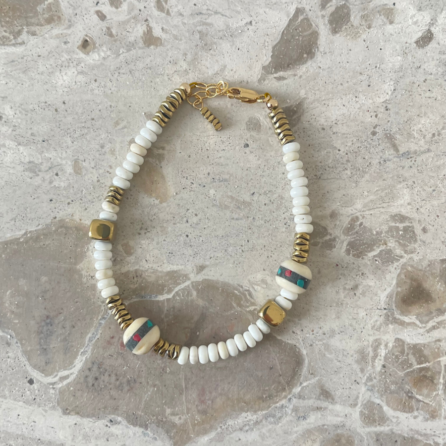 Bracelet White Lotus en howlite, hématite et perles en os népalaises.