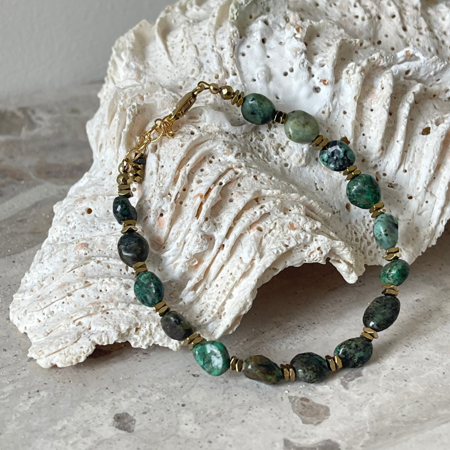 Les perles de turquoise africaine, reconnaissables à leurs nuances vert profond marbrées, offrent un caractère organique et unique à chaque pièce. Les touches d’hématite dorée apportent contraste et lumière, soulignant délicatement la structure du bijou.