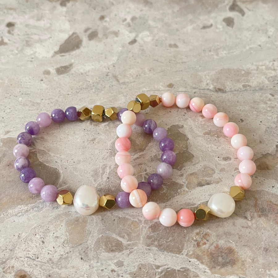 Ces bracelets en pierres naturelles sont construits autour d’une perle centrale en nacre, choisie pour son éclat doux et naturel. La nacre reflète délicatement la lumière. Ainsi, elle apporte une touche lumineuse et élégante au bijou.