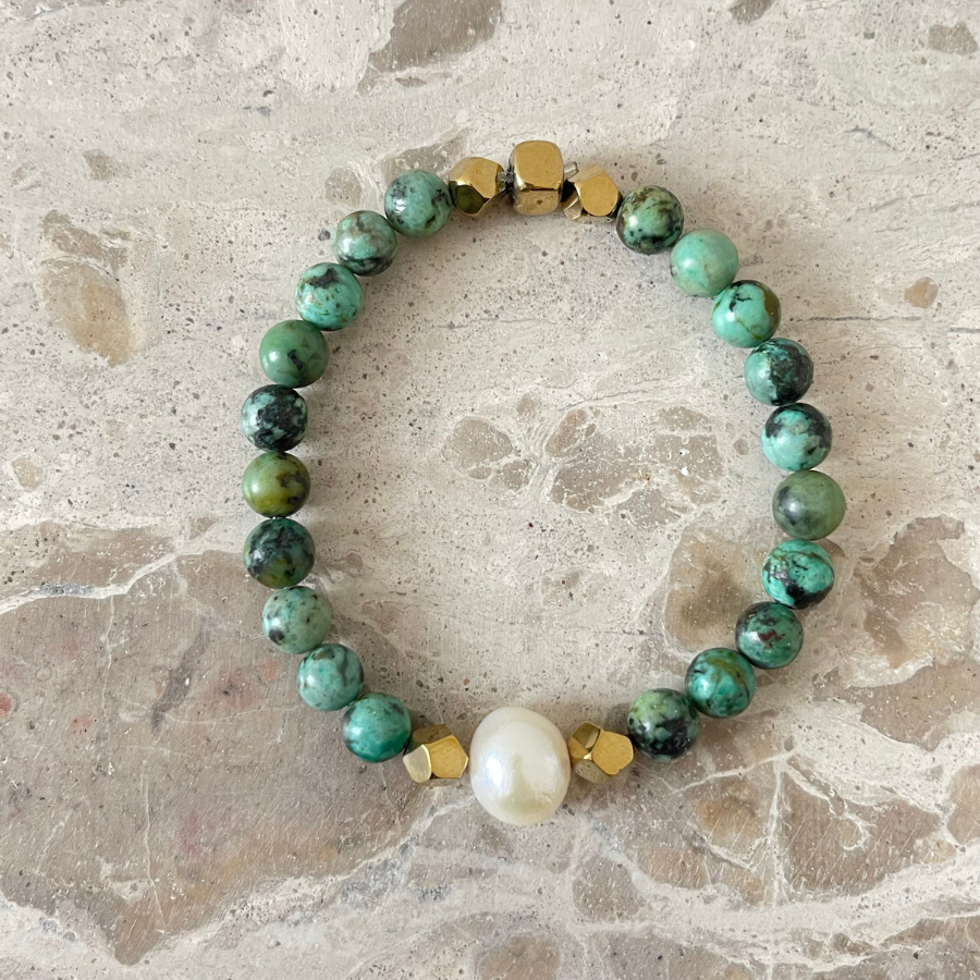 La turquoise dévoile des teintes bleues et vertes lumineuses. Ainsi, elle apporte fraîcheur et énergie au bracelet.