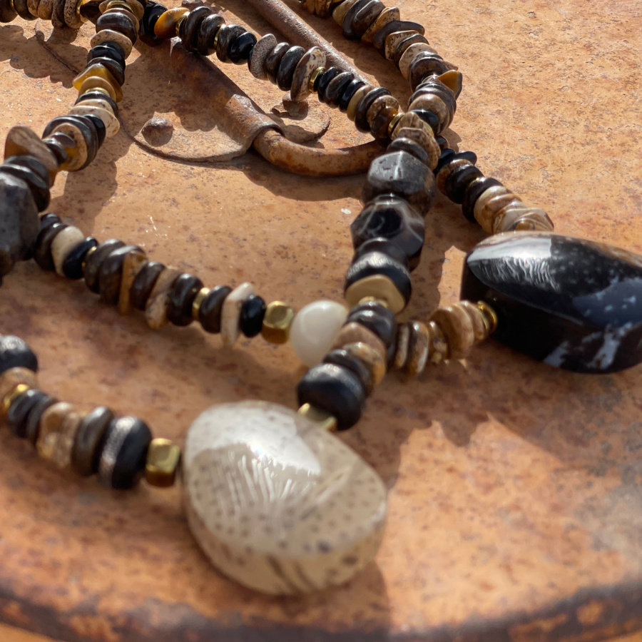 Unique en son genre, le collier "FOSSILE" est une pièce d'exception avec son pendentif en bois pétrifié de palmier de Madagascar, témoin d'une histoire naturelle millénaire.