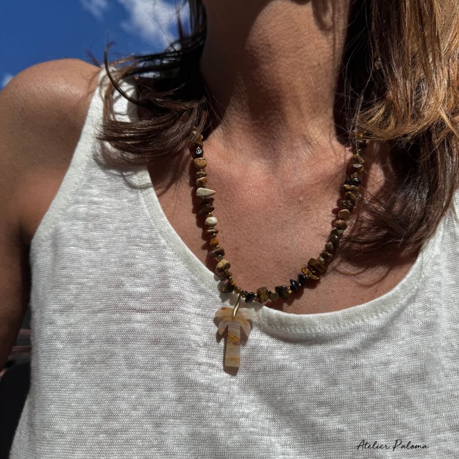 Composé de fragments de pierres semi-précieuses et de perles facettées, ce bijou joue subtilement avec la lumière et les textures. On y retrouve des nuances de brun et noir, créant un ensemble riche et équilibré. Au centre, un pendentif en pierre naturelle (oeil de tigre) en forme de palmier.