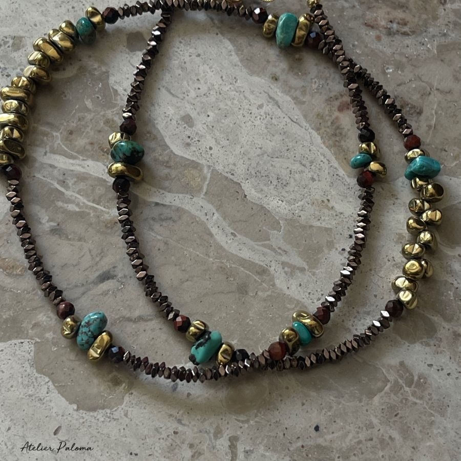 Collier artisanal en hématite marron et dorée, turquoise et œil de taureau, au style naturel et lumineux.