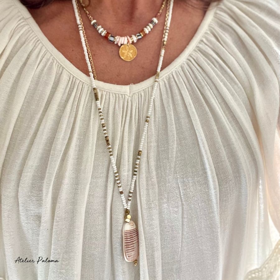 Facile à porter au quotidien, ce collier accompagne aussi bien une tenue estivale qu’un style plus naturel et épuré. Chaque pièce étant réalisée à la main dans mon atelier à Bordeaux, elle possède un caractère unique.