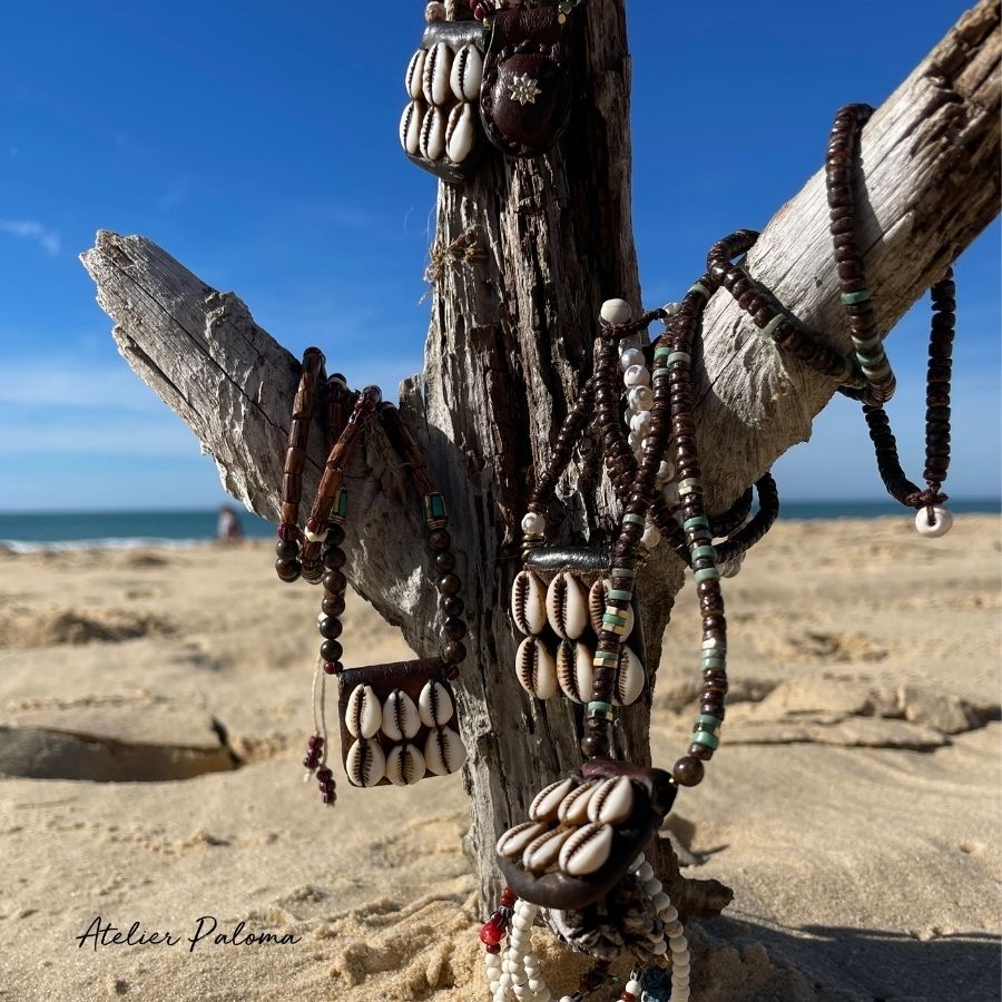 • Éléments : perles africaines, howlite, perles indiennes, bronzite, tubes de coco, coquillages cauris.