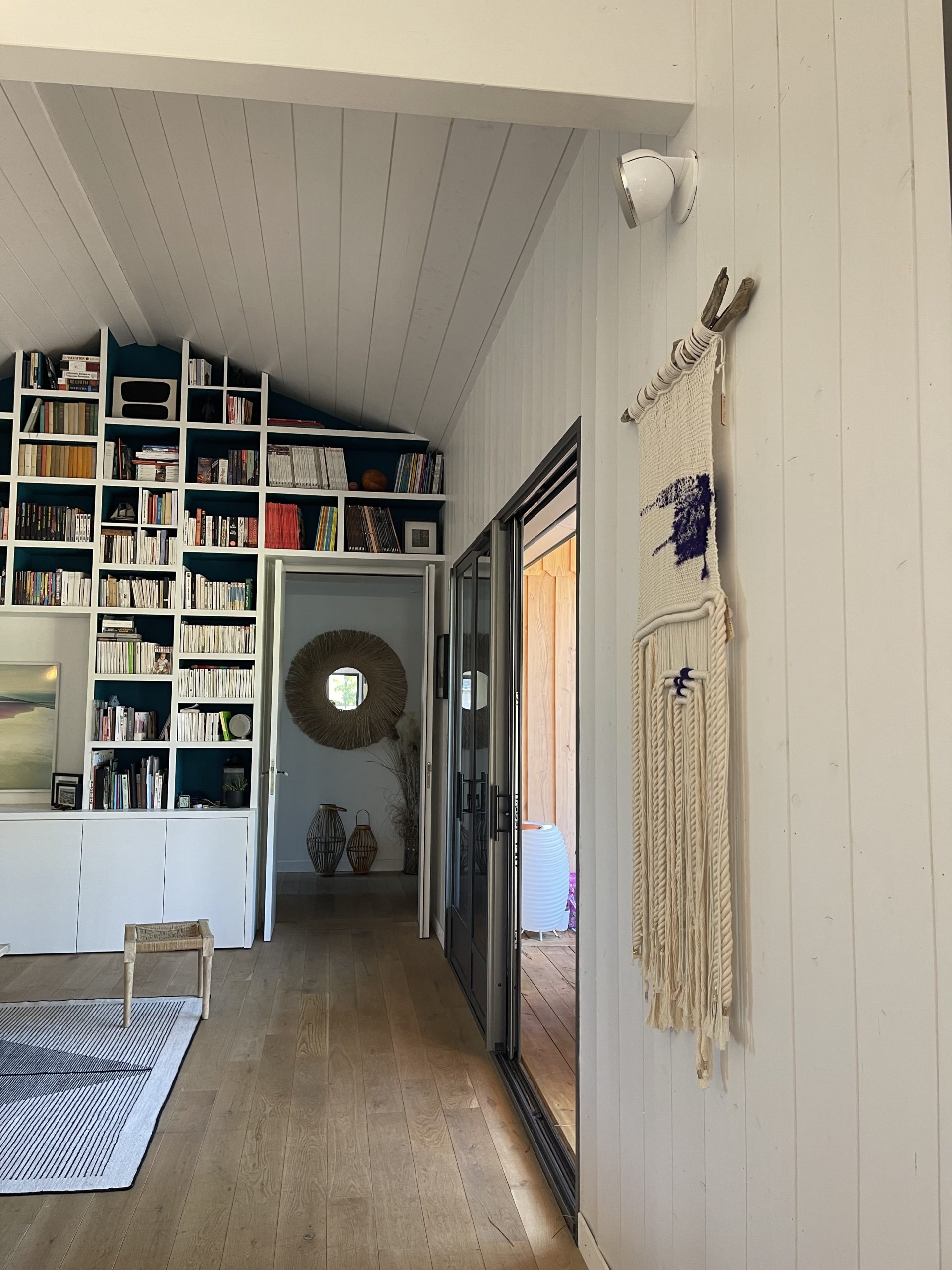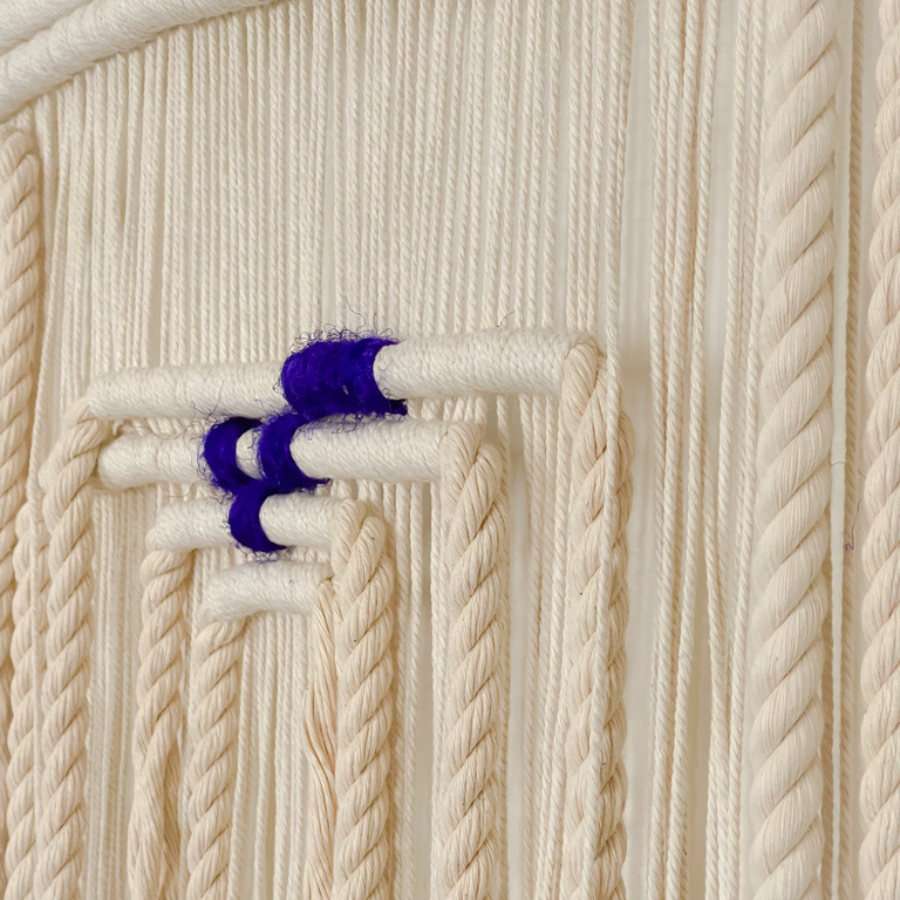 Le tissage devient un jeu de cordes qui s'entremêlent et se chevauchent pour créer une géométrie structurée et apaisante.