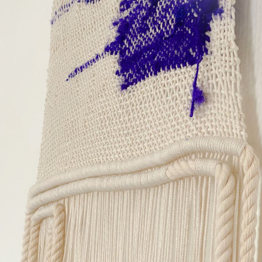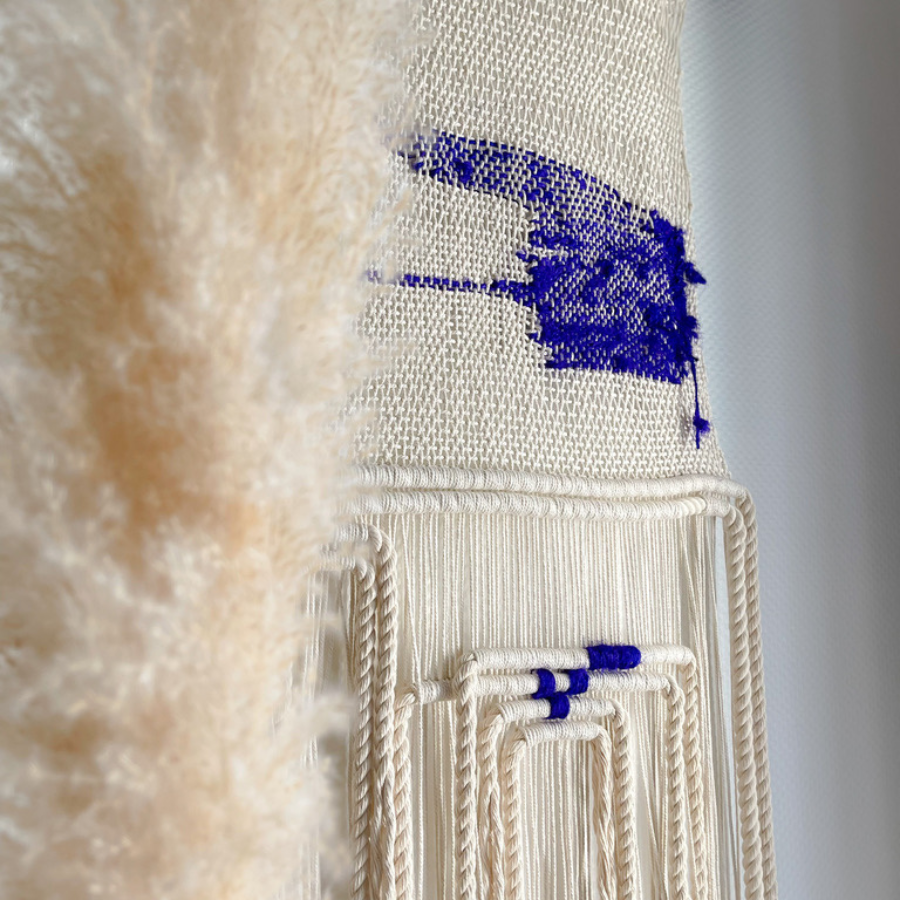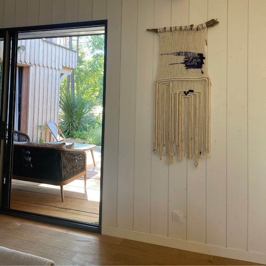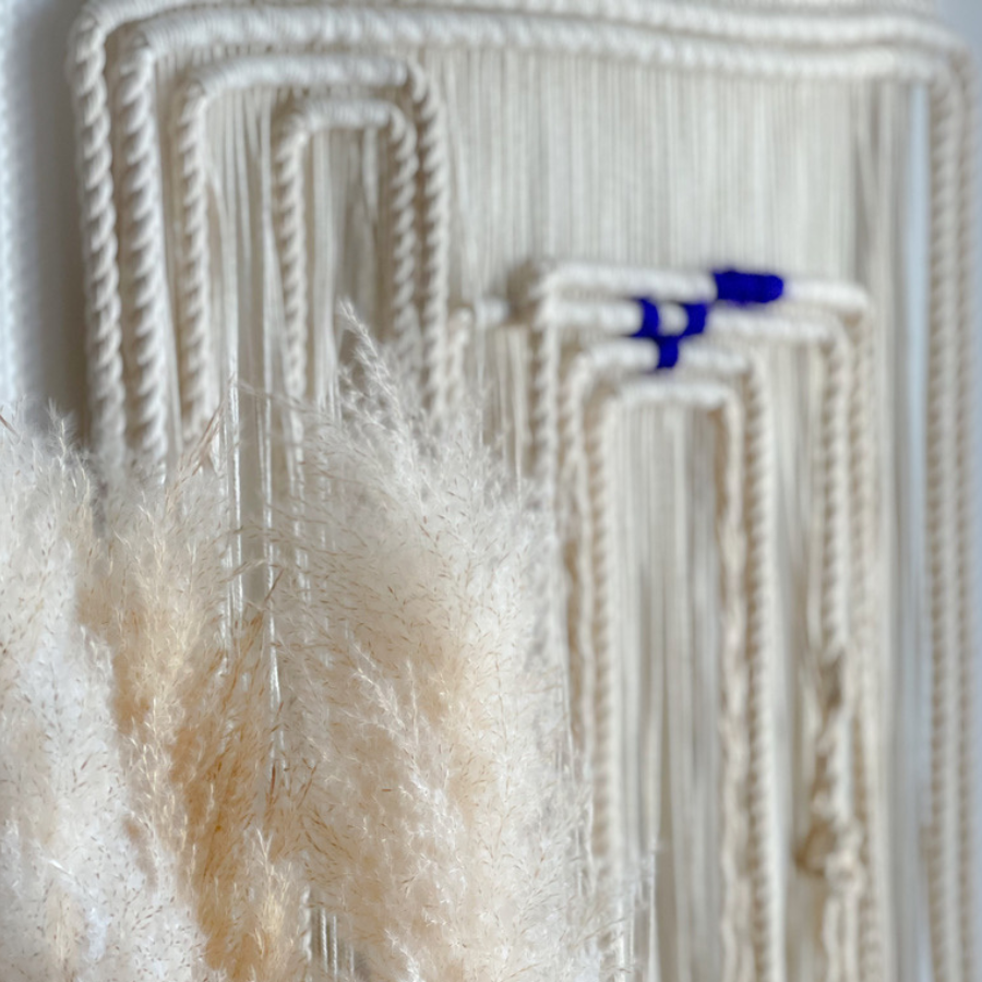 Laissez-vous envouter par "CARRÉ BLEU", une œuvre textile murale entièrement façonnée à la main.