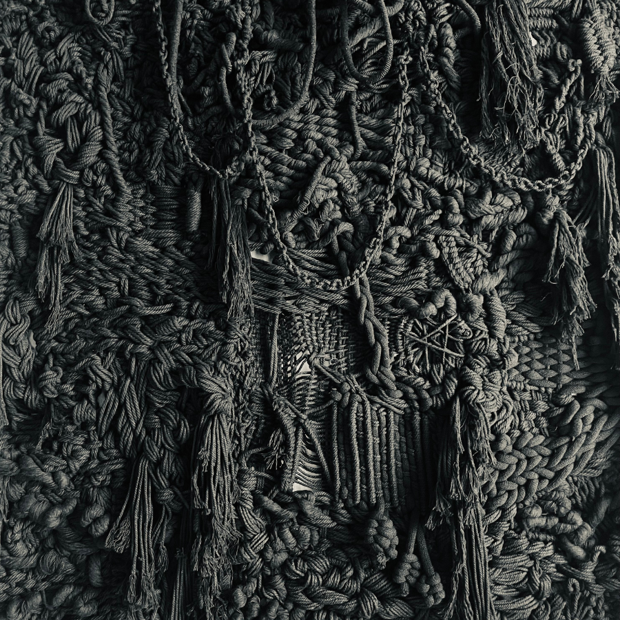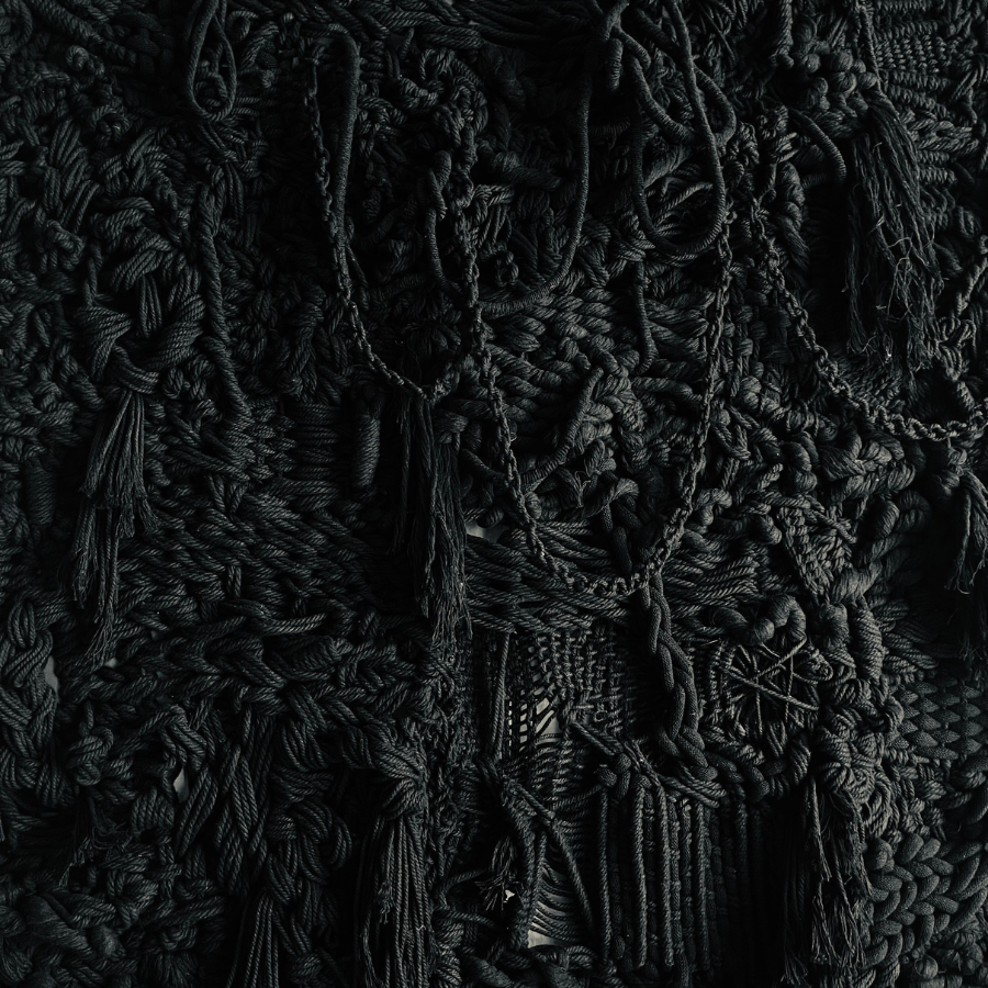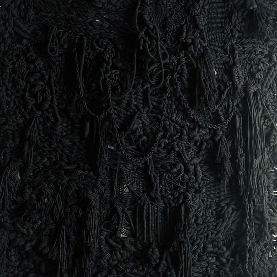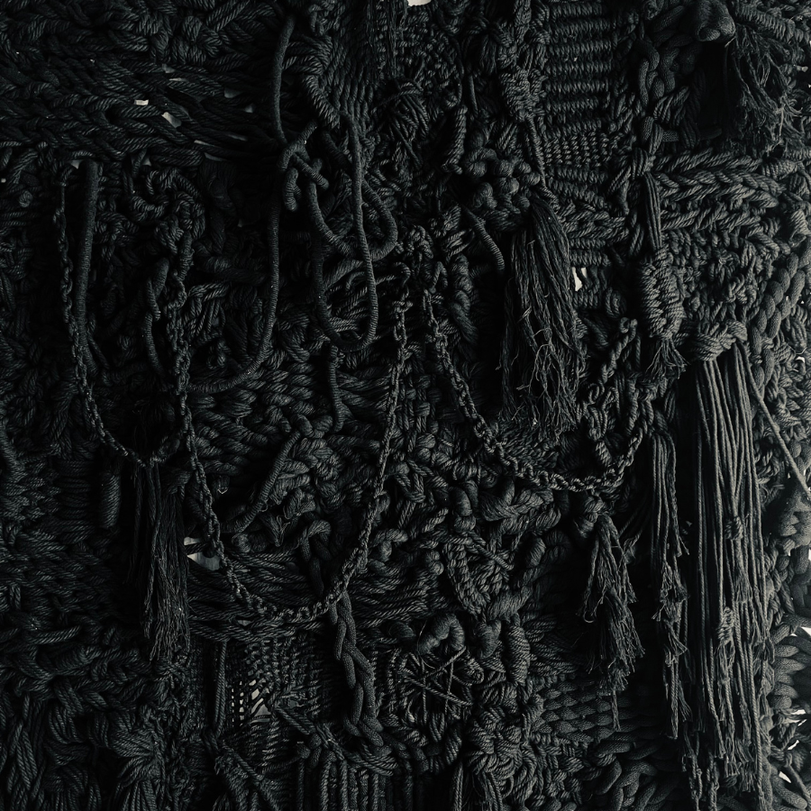 Réalisé en corde noire, ce macramé mural contemporain explore la densité de la matière et la puissance du relief. La profondeur du noir révèle chaque détail du nouage. Ainsi les torsions, tressages, franges et volumes se déploient dans une composition riche et organique. La monochromie permet au regard de se concentrer sur la structure même du tissage mural fait main, sur l’architecture du fil et sur la tension du geste.