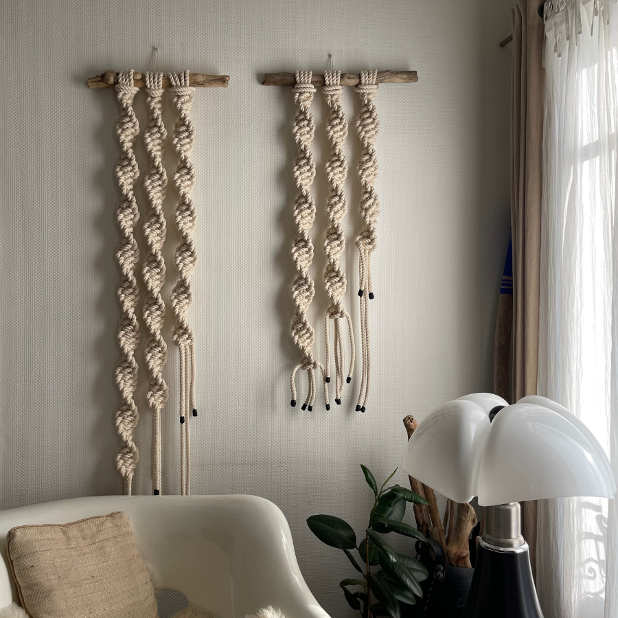 Réalisé en grosse corde de coton bio toroné, fabriquée artisanalement dans l’une des dernières corderies françaises encore en activité, ce macramé mural contemporain incarne un savoir-faire textile rare et précieux. Le coton biologique toroné apporte une structure dense, une tenue remarquable et une texture profonde qui renforce le caractère sculptural de la pièce.