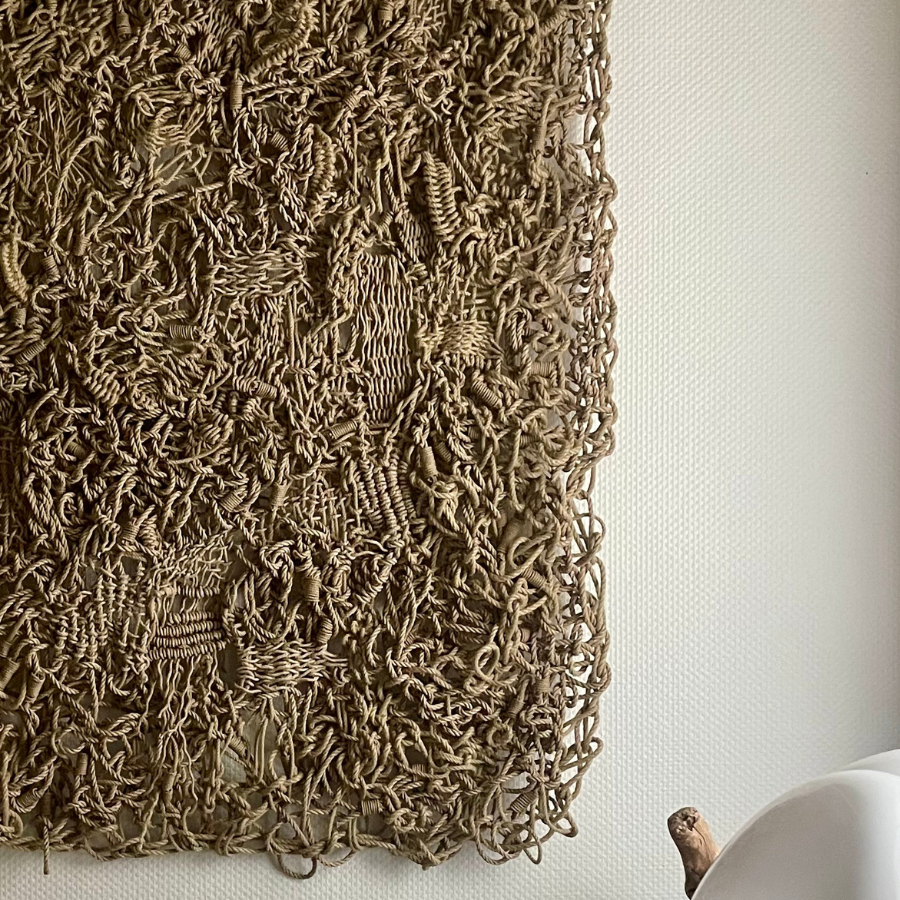 La pièce est réalisée en corde en matière naturelle associée à du chanvre synthétique créant un contraste maîtrisé entre authenticité brute et tension contemporaine. Cette dualité donne naissance à une œuvre à la fois organique et structurée, où la matérialité est pleinement assumée.