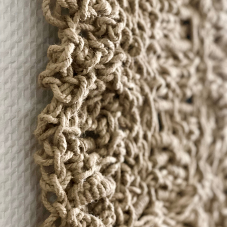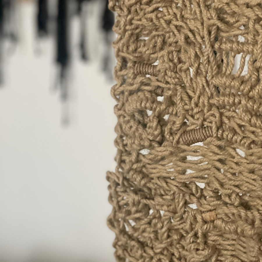 Plus qu’un simple tissage mural, il s’agit d’une exploration de la matière et du geste. Chaque nœud en macramé compose une cartographie organique, une architecture textile où la densité dialogue avec le vide. Le relief devient langage. La fibre devient écriture.